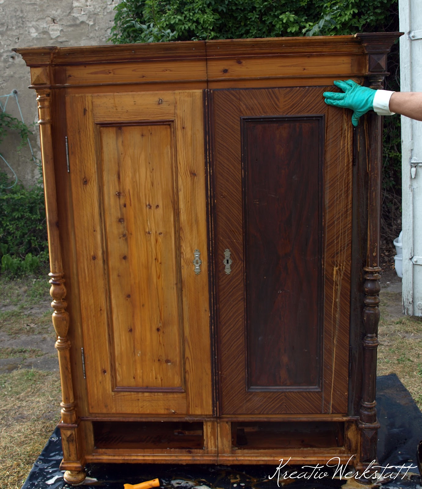 Alten schrank von farbe befreien. Alte lack und farbschichten auf möbeln sind oft unansehnlich und ruinieren den optischen eindruck den das möbelstück macht. Mit einem schwingschleifer oder bandschleifer bekommen sie die alte farbe von der wand. So wie es aussieht ist eine grundierung drauf.