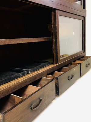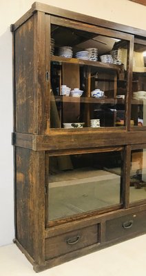 Antiker japanischer teeschrank aus der taiso periode um 1900 zweiteiliges mizuya dansu mit vitrinen aufsatz schrank buffet vitrine taisoperiode 1912 bis 1926 vom jugendstil beeinflusst vitrinen schiebetür mit geätzter glasumrandung mit zahlreichen türchen und schublädchen wunderschöne beschläge feine gravuren im griffbereich.